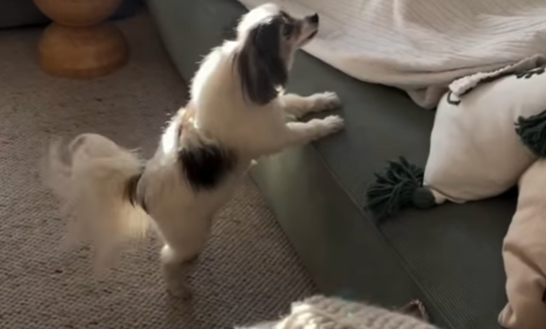 13 -Phalène do ano foi pego em torno do apartamento, até cheirando os muitos cobertores sob seus donos antes de passear para continuar sua busca. Finalmente, seus instintos o levaram de volta para uma segunda olhada – e então ele finalmente os descobriu e desfrutou de muitos aconchegantes.