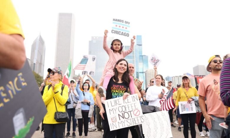 A previsão de chuva não impediu que multidões se reunissem no Grant Park, em Chicago, no sábado, para um protesto contra o governo Trump.