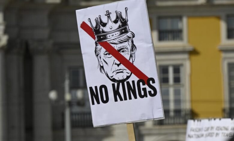Os manifestantes começaram a reunir-se em Los Angeles e noutros locais do sul da Califórnia no sábado para os protestos “No King”, um esforço nacional para reagir contra o presidente Trump.